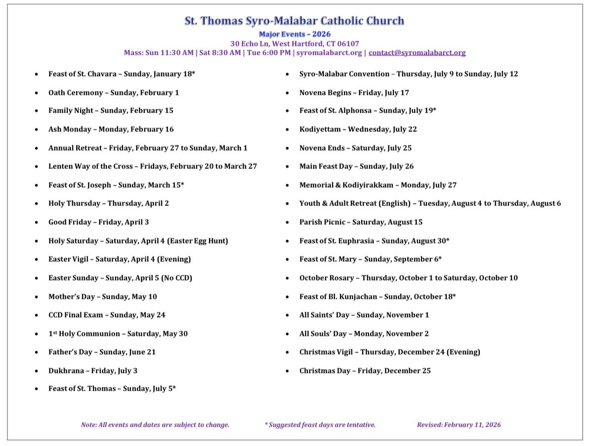 Welcome to St. Thomas Syro-Malabar Catholic Church! Our parish is a spiritual home where faith, tradition, and community thrive. Together, let us deepen our relationship with Christ through prayer, sacraments, and service. May God bless you and your families abundantly as we walk this journey of faith together.
